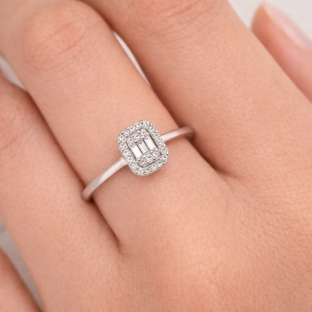 Kare formda tasarlanmış üst bölüm, yüzüğe modern ve dengeli bir karakter kazandırır. Çevresindeki halo taş dizilimi, merkez formu belirginleştirirken daha dolgun bir görünüm sağlar. Bu detay, yüzüğün ışık performansını artırır.