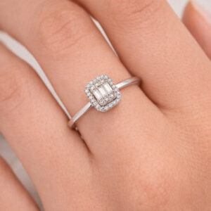0.35 Karat Baget Pırlanta Köşeli Halo Yüzük Beyaz Altın Minimal Lüks