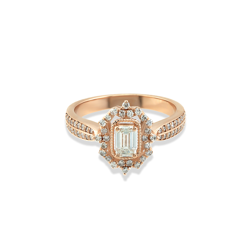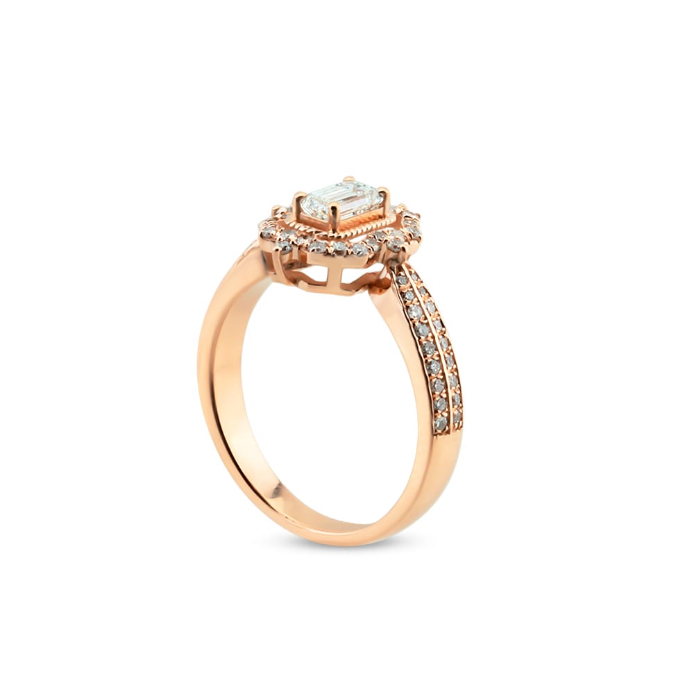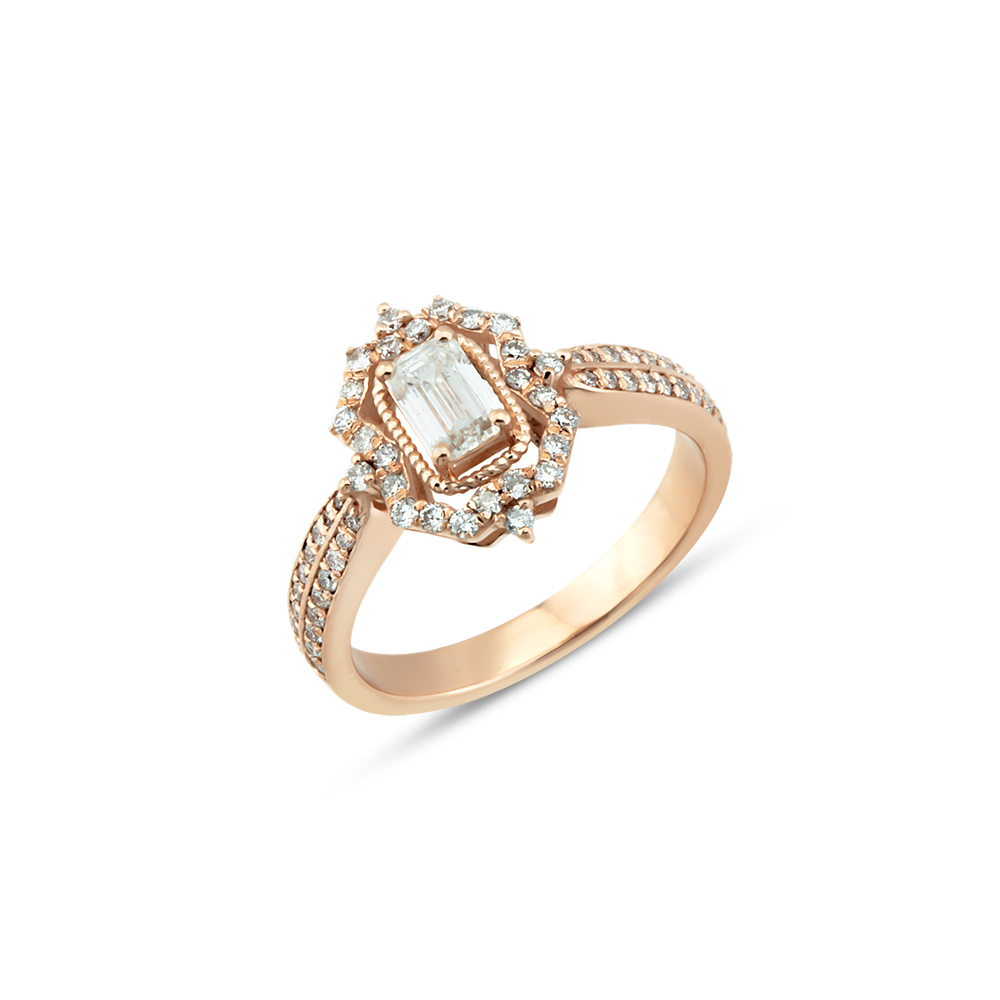 Vintage tarzın en romantik ve ışıltılı hali burada. Toplam 0.75 karat pırlantayla hazırlanmış bu yüzük, merkezde 0.40 karat emerald kesim bir taş taşıyor. Dikdörtgen formuyla sofistike ve dikkat çekici.
