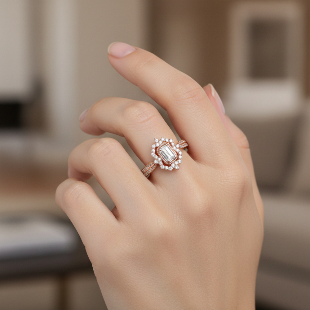 Bu yüzük, geçmişin zarafetiyle bugünün ışıltısını birleştiriyor. Star Kuyumculuk’un “Romantic Vintage Halo” serisinden – emerald kesimin en duygusal hali.