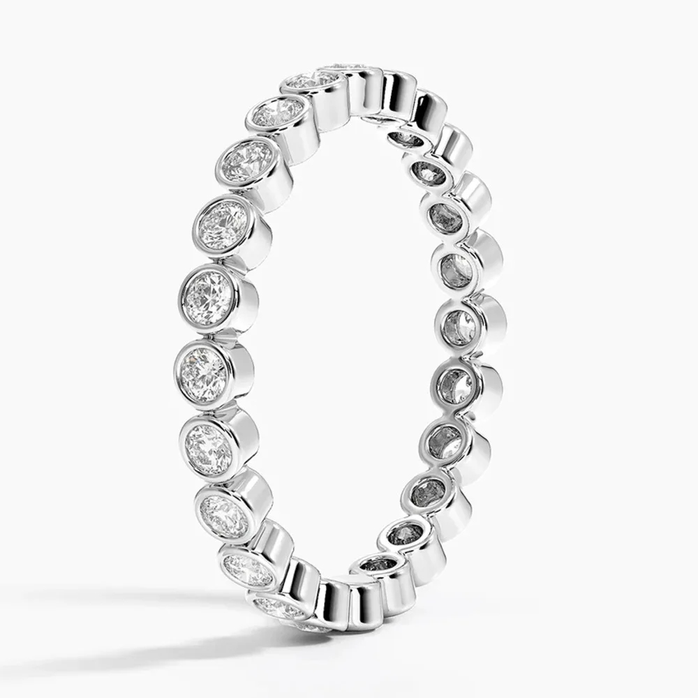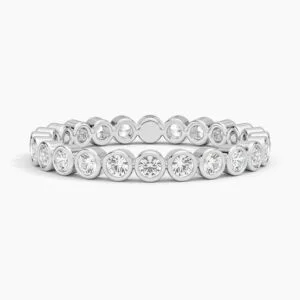 Bu tamtur yüzük, yuvarlak pırlantaların en güvenli ve şık hali. Toplam 0.80 karat taş, tam tur boyunca bezel (çerçeve) kaplama ile yerleştirilmiş. Her pırlanta metal çerçeve içine gömülü. Bu sayede hem korunuyor hem de düzgün bir parlaklık veriyor.