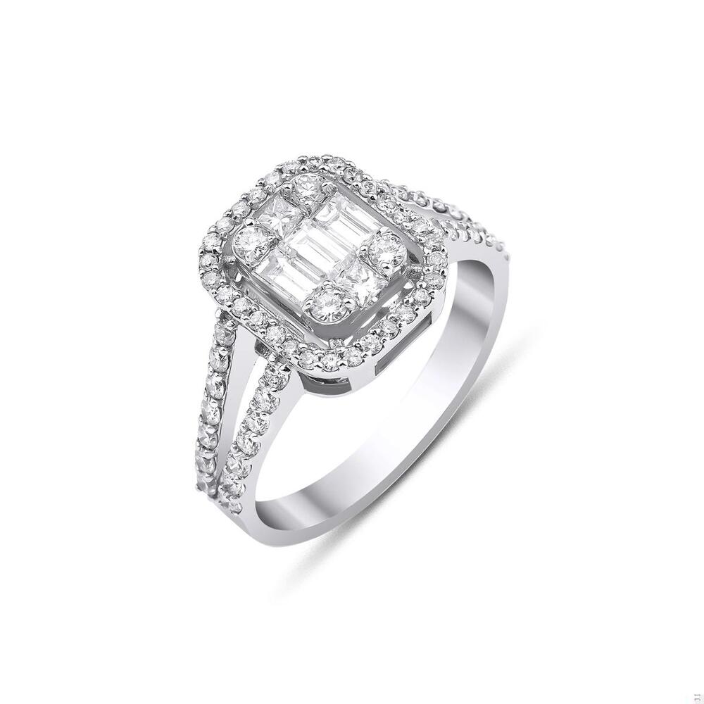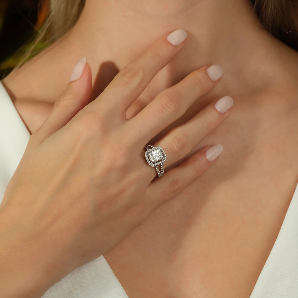 Baget Pırlanta Yüzük Çift Sıra Kollu Halo Tasarım