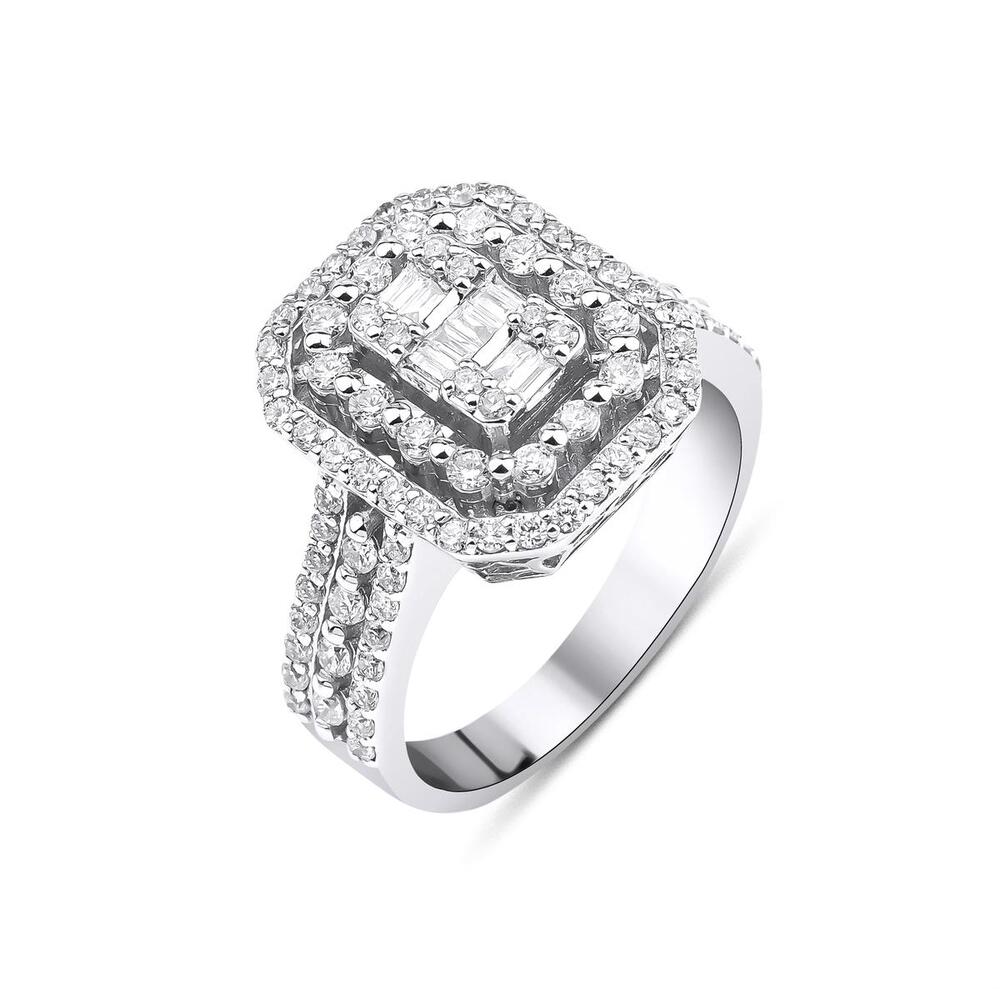 Merkez bölümde bir araya getirilen baget taşlar, yüzüğe düzenli ve net bir görünüm verir. Bu yapı, klasik tektaşlardan farklı olarak daha geniş yüzeyli ve dolgun bir etki yaratır. Aynı zamanda ışığı daha kontrollü yansıtarak şık bir parlaklık sunar.