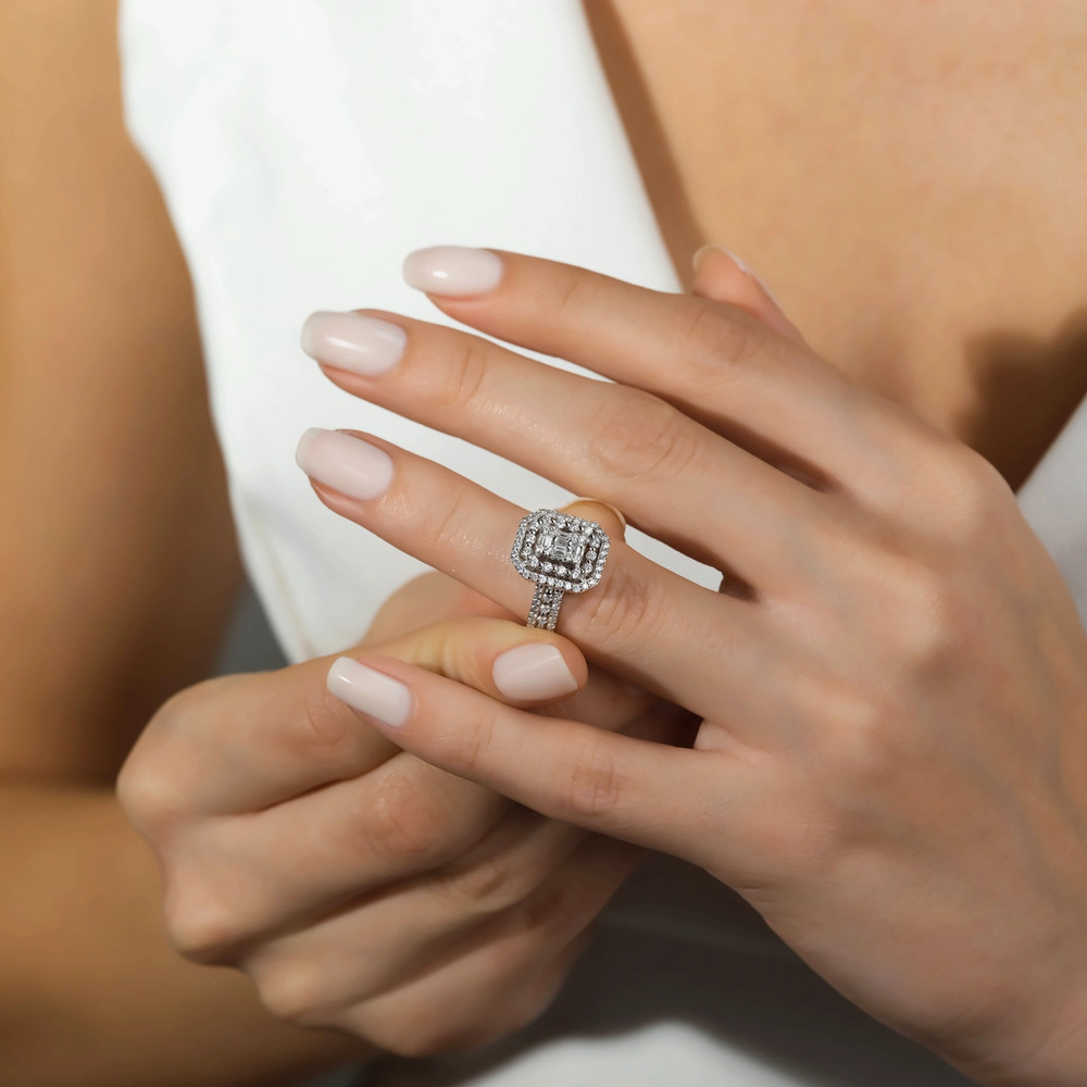 Baget taşların etrafında yer alan yuvarlak pırlantalar, tasarıma hareket katar. Katmanlı şekilde ilerleyen bu dizilim, yüzüğün her açıdan ışık almasını sağlar. Işıltı tek noktadan değil, yüzüğün tamamına yayılır.