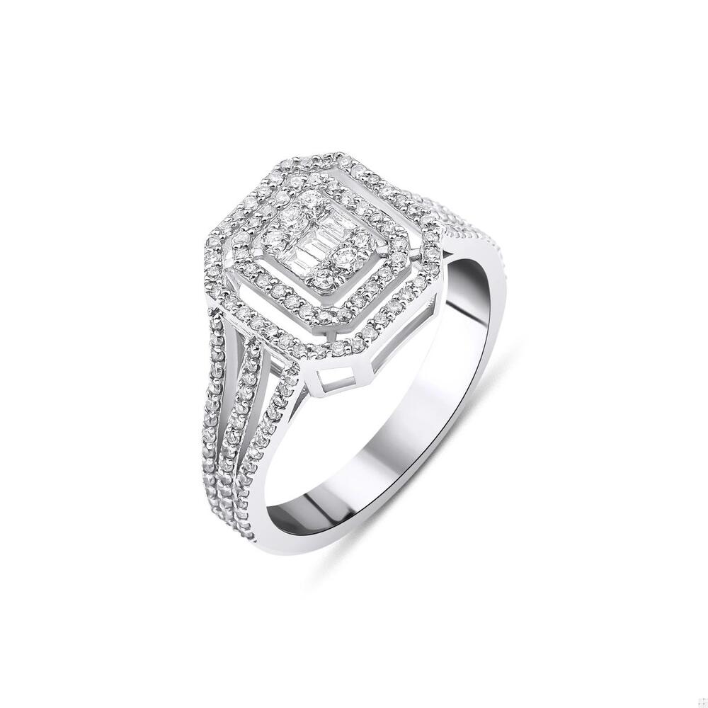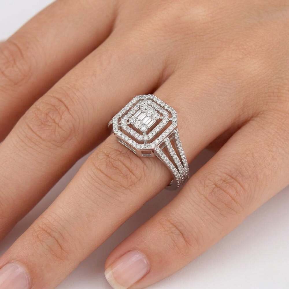 Bu yüzük, güçlü bir tasarım dili ile hazırlanmıştır. Merkezde yer alan baget kesim pırlantalar, düzenli ve net hatlarıyla dikkat çeker. Işık, yüzey boyunca dengeli şekilde yayılır ve kesintisiz bir parlaklık oluşturur.