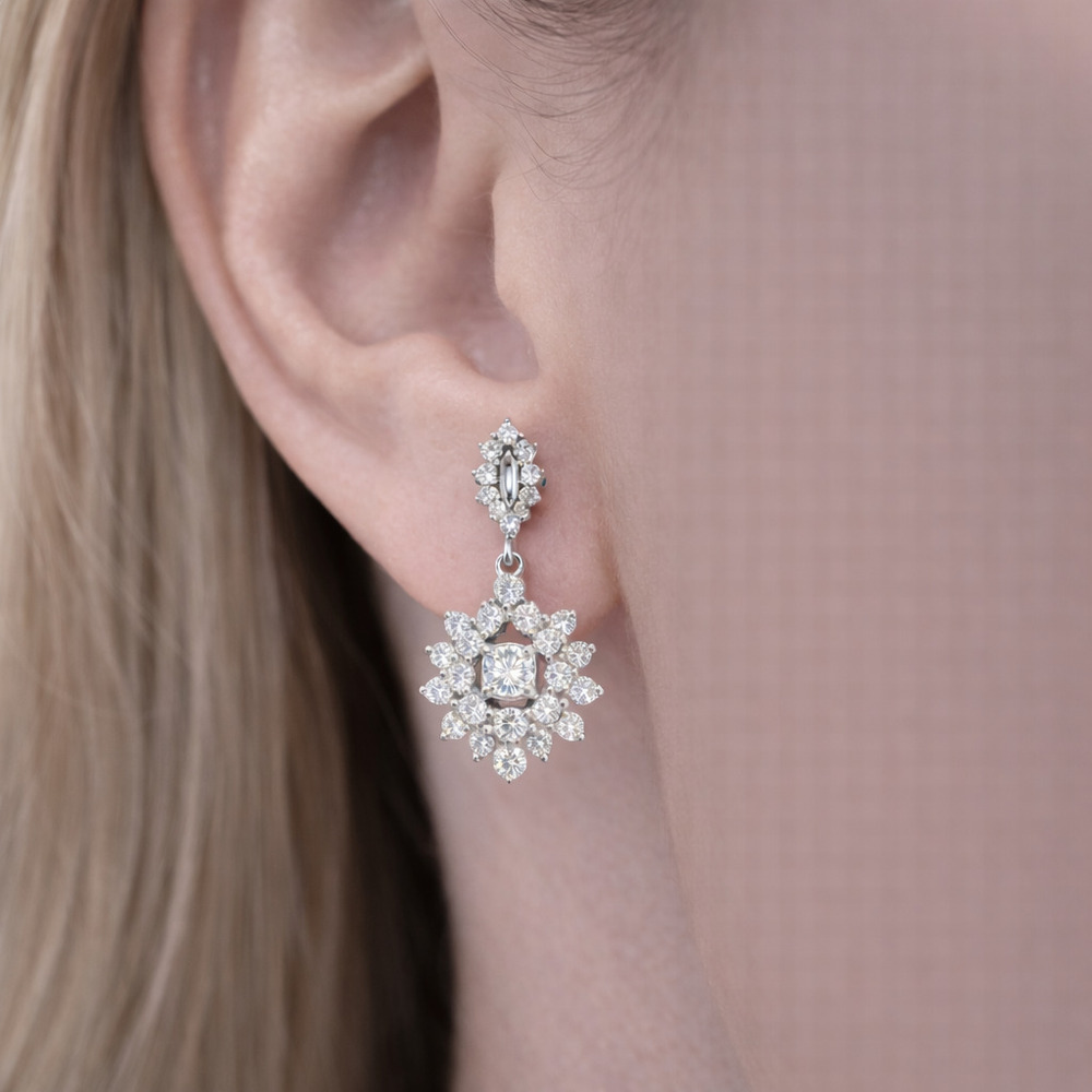 Pırlanta küpe – floral cluster damla halo drop tasarım, romantik zarafet ve timeless parlaklık!
