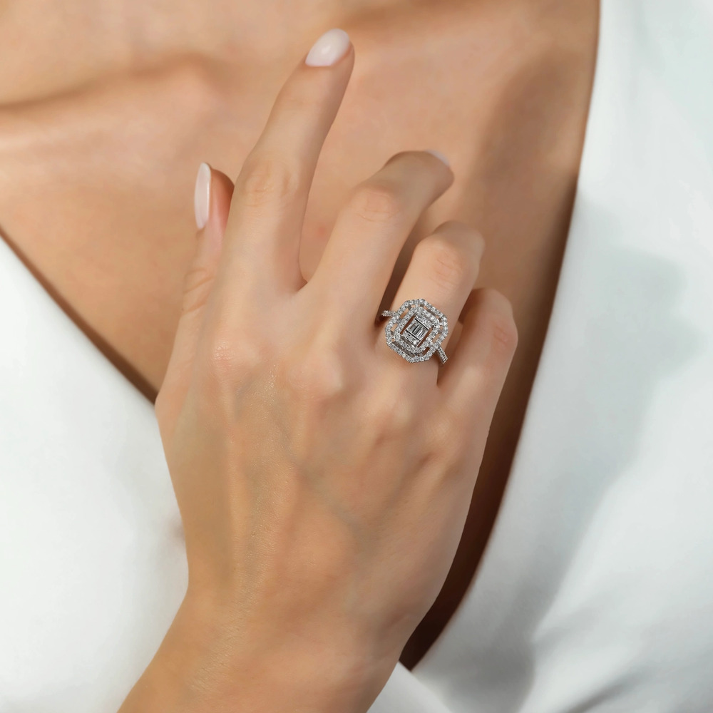 Bu özel tasarım yüzük, klasik baget taş şıklığını modern bir form ile buluşturur. Merkezde yer alan baget kesim pırlantalar, düzenli ve güçlü bir ışık yansıması sunar. Bu sayede yüzük, sade bir ışıltıdan çok daha fazlasını verir.
