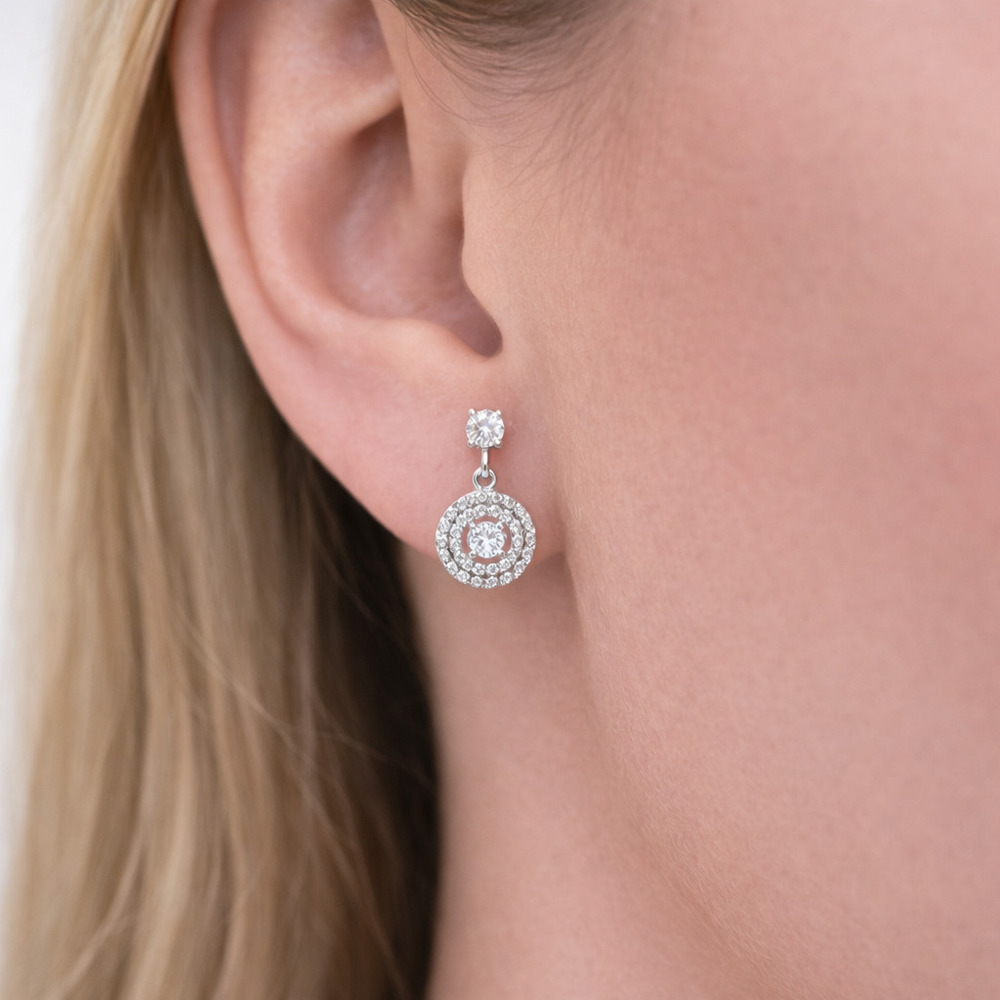 Bu küpe, çift halo yuvarlak drop pırlantanın en sofistike hali. Star Kuyumculuk’un “Double Halo Drop” serisinden – katman ve ışıltının kusursuz uyumu.