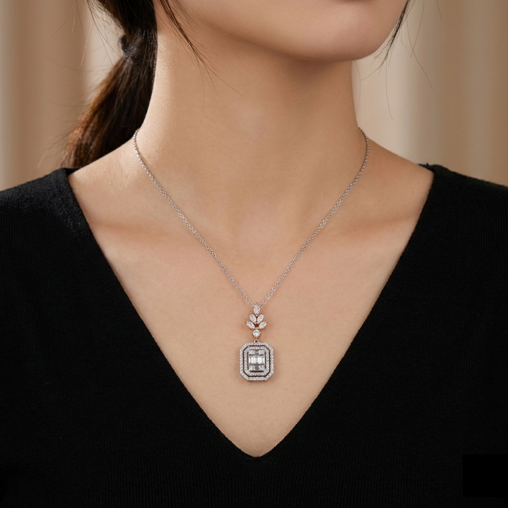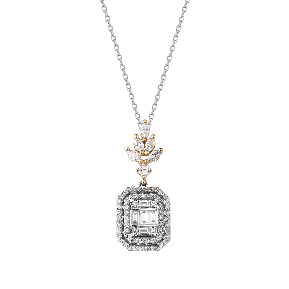 Bu pırlanta kolye, baget kesim taşların en sofistike hali. Alt kısımda emerald (dikdörtgen) kesim baget pırlantalar halo içinde yer alıyor. Çift sıra yuvarlak pırlantalarla çevrelenmiş. Üstte markiz kesim yaprak detayı var. Bu floral üst kısım kolyeye romantik bir dokunuş katıyor.