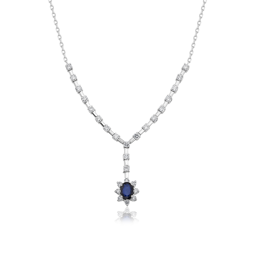 Bu pırlanta kolye, derin mavi safirin büyüleyici uyumu. Merkezde oval kesim bir safir yer alıyor. Etrafı yuvarlak pırlantalarla halo şeklinde çevrelenmiş. Bu halo detay safiri daha büyük gösteriyor. Derin mavi tonuyla göz alıcı bir kontrast yaratıyor.