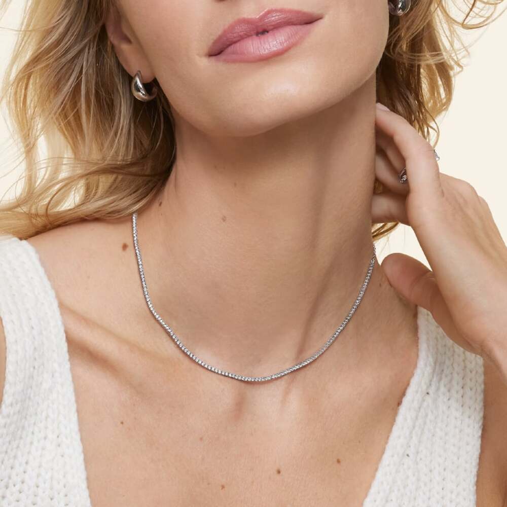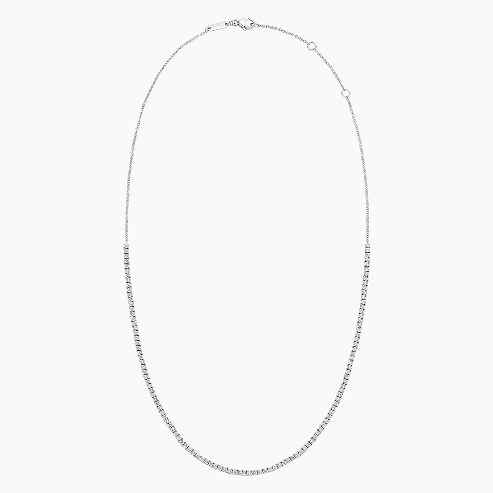 Bu pırlanta kolye, su yolu (riviera) tasarımının en göz alıcı hali. Yuvarlak brilliant kesim pırlantalar kullanılmış. Taşlar tek sıra halinde sıkıca dizilmiş. Her taş dört tırnakla tutulmuş. Kesintisiz bir ışıltı akışı yaratıyor. Boyun hattını zarifçe takip eden ince modeli. Her açıdan maksimum parlaklık sunuyor.