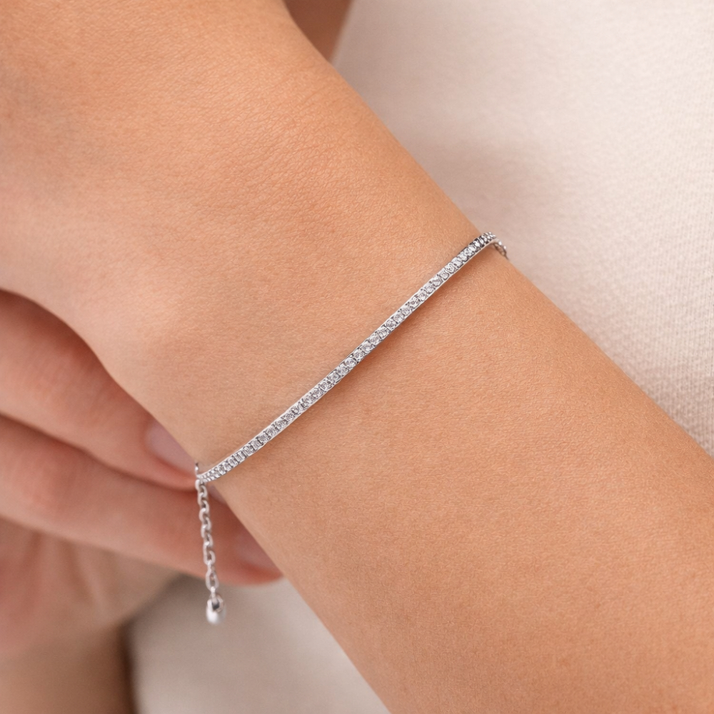 Sert ve ince yapısı sayesinde bilekte hafif bir duruş sergiler. Minimal çizgileriyle sade bir şıklık sunarken, pırlanta detaylarıyla göz alıcı bir ışıltı oluşturur. Günlük kullanım için ideal olduğu gibi, özel anlarda da zarif bir tamamlayıcı olarak tercih edilebilir.