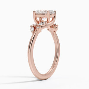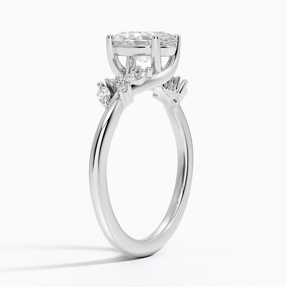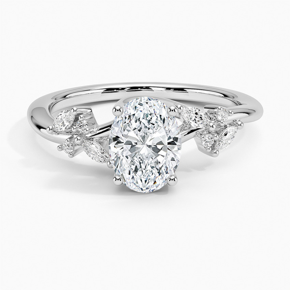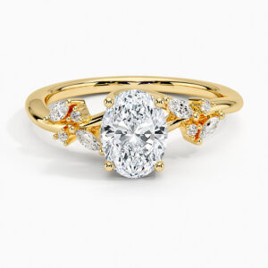 Merkez taşı iki yandan eşlik eden markiz kesim pırlanta detaylar, tasarıma sofistike bir hareket kazandırır. Bu yan taş yerleşimi, oval pırlantanın ışıltısını güçlendirirken yüzüğe dengeli ve akıcı bir form kazandırır.