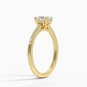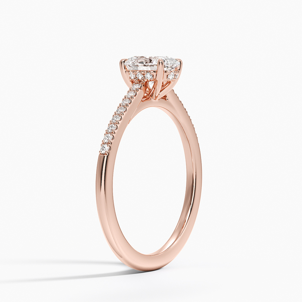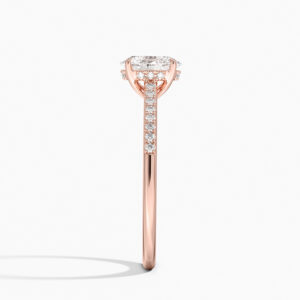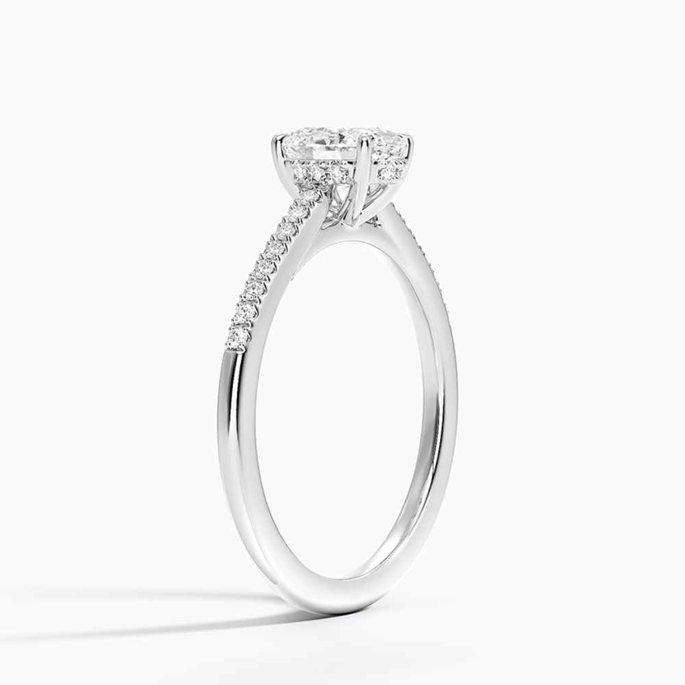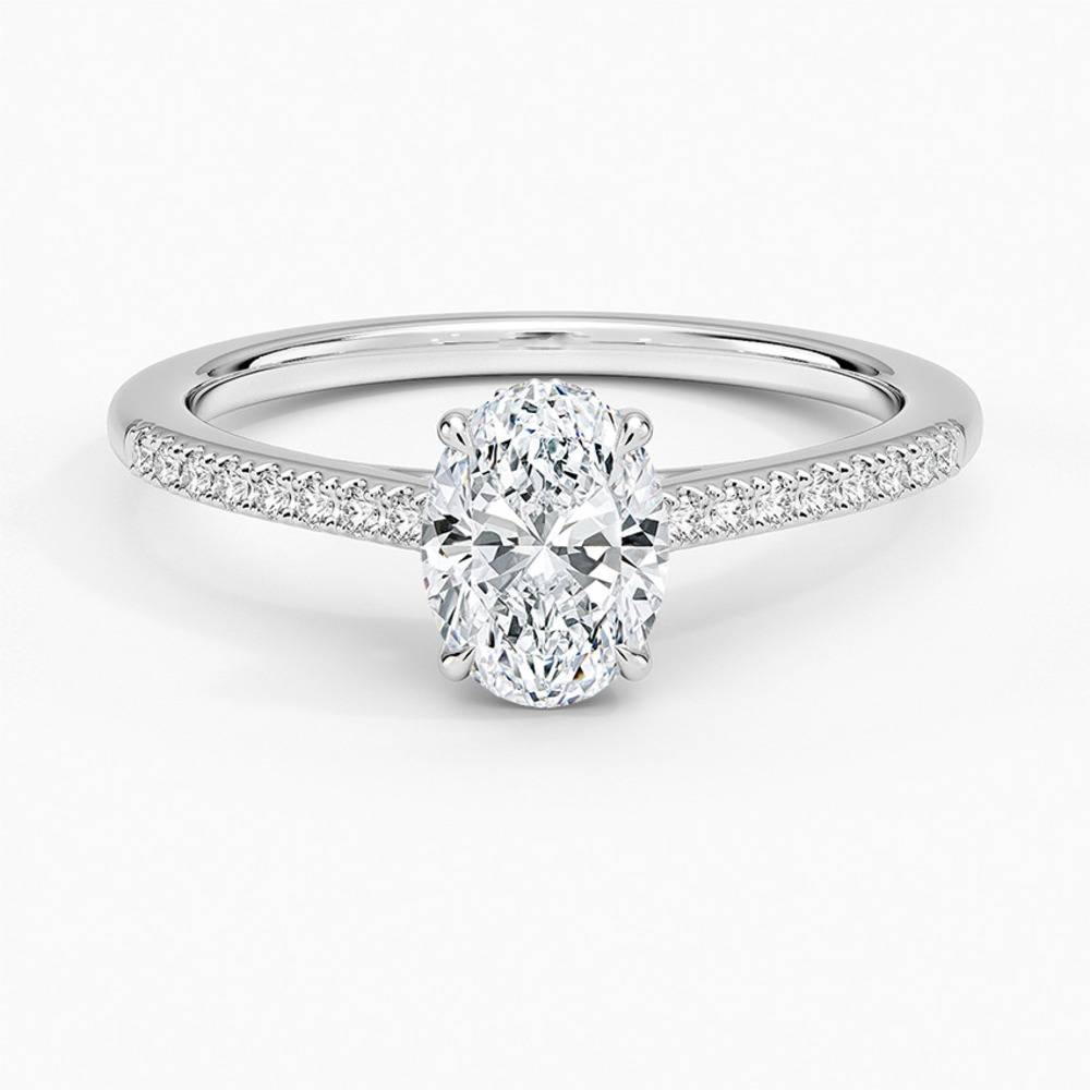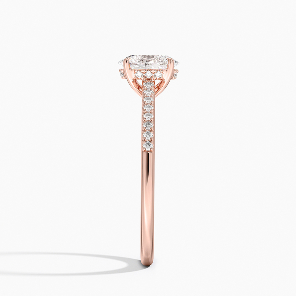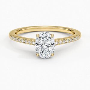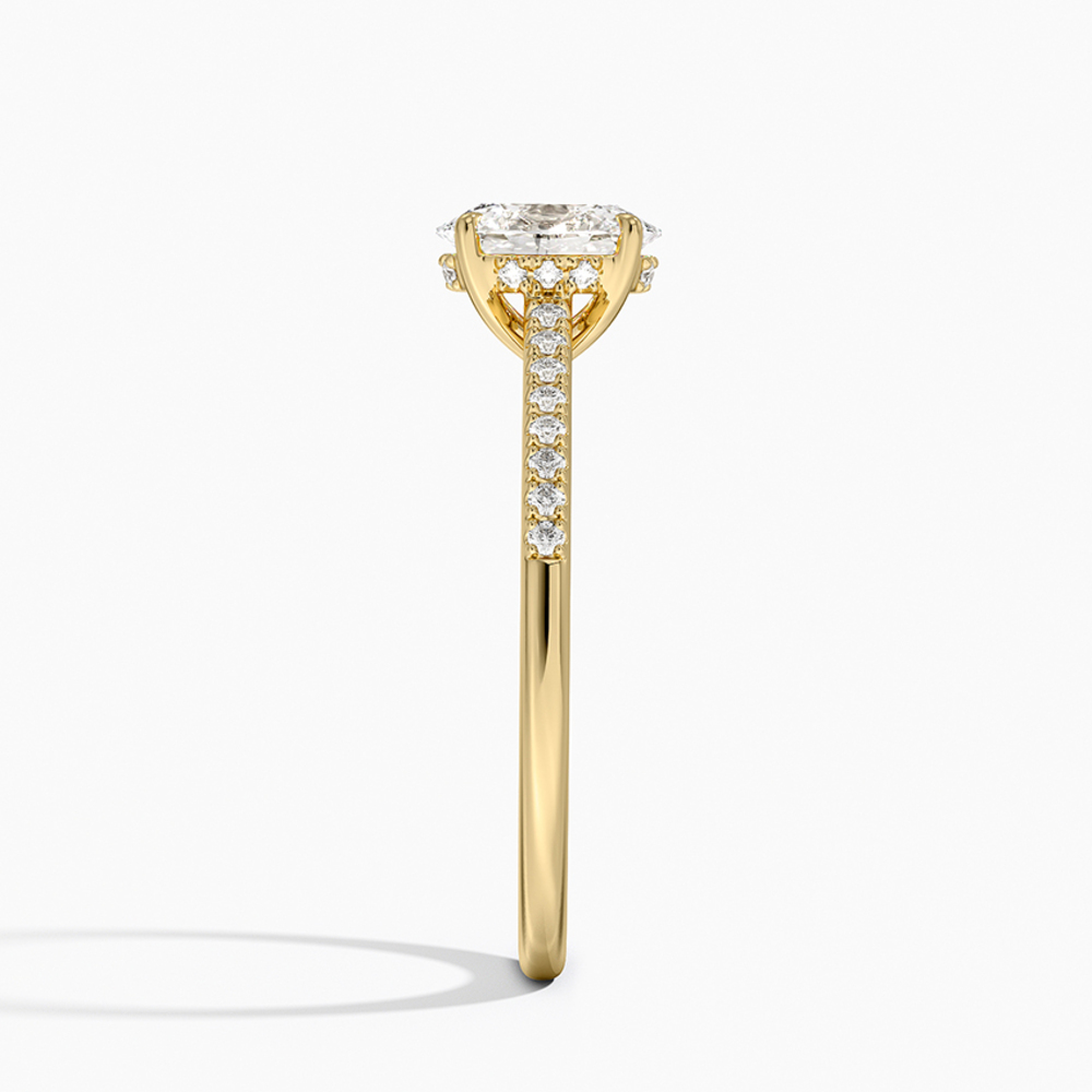 Oval kesim merkez pırlantasının altında zarifçe gizlenmiş “hidden halo” detayı ve yüzük kolunda sıralanmış ince minimal pavé pırlantalarla tamamlanan bu tektaş, günümüzün en çok tercih edilen modern klasiklerinden. Orta taşın etrafını sarmalayan gizli ışıltı, taşı çok daha büyük ve ateşli gösterirken, koldaki minimal pavé sıra ise her hareketinizde göz alıcı bir parlama yaratıyor. Hem sade hem de detayda lüks arayanların vazgeçilmezi; nişan, söz veya kendinizi şımartmak için mükemmel seçim.