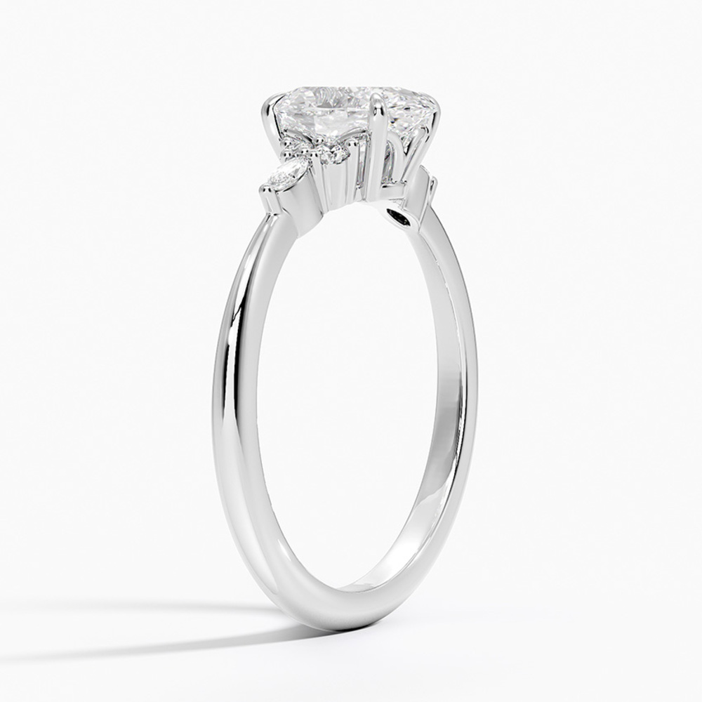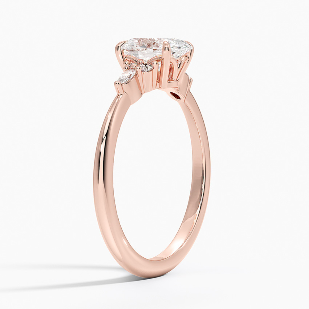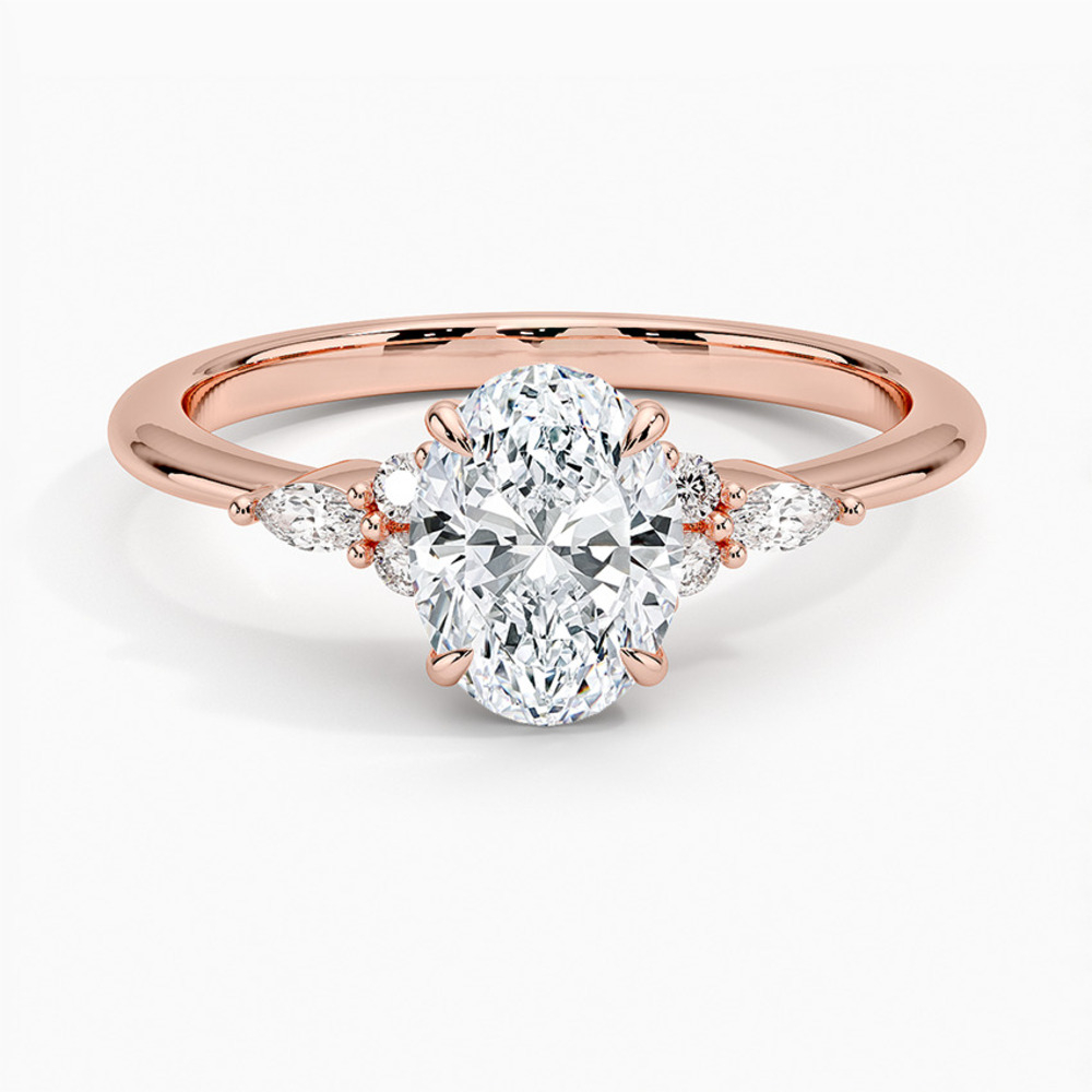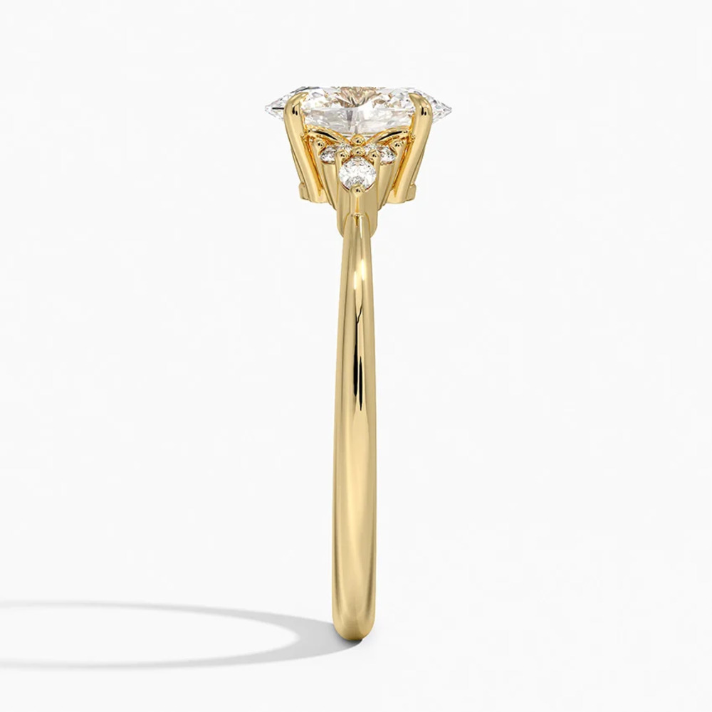 Merkez taşın her iki yanında konumlanan markiz kesim pırlantalar ve onları tamamlayan yuvarlak pırlanta detayları, yüzüğe dengeli ve estetik bir ışık akışı kazandırır. Bu kombinasyon tasarıma hem romantik hem de sofistike bir karakter kazandırır.
