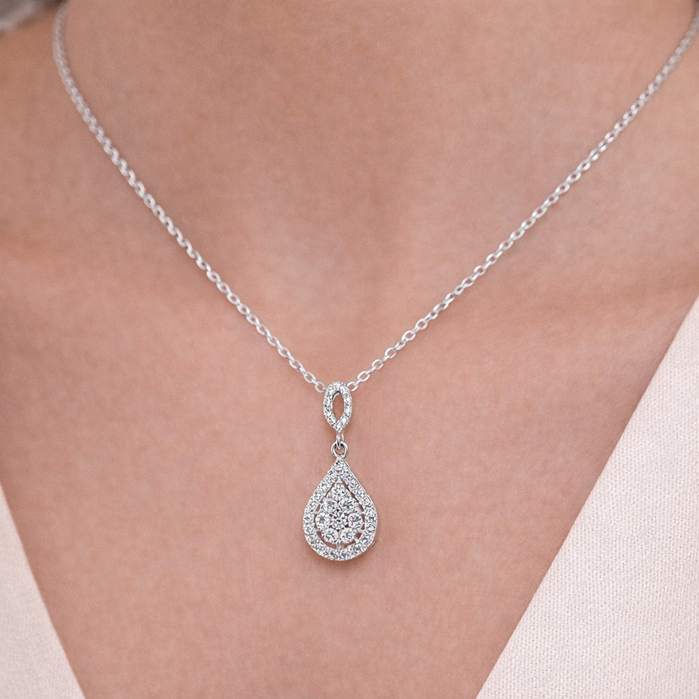 Bu kolye, damla cluster yaprak üstlü pırlantanın en romantik hali. Star Kuyumculuk’un “Teardrop Leaf Drop” serisinden – doğa esintisi ve ışıltının kusursuz uyumu.