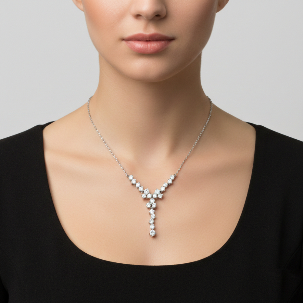 Bu kolye, Y şekilli cluster drop pırlantanın en gösterişli hali. Star Kuyumculuk’un “Y Cluster Drop” serisinden – hareket ve ışıltının kusursuz uyumu.