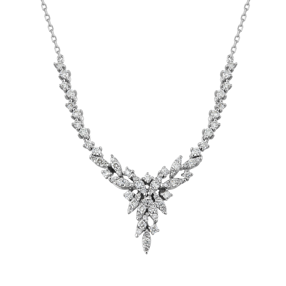 Fantezi tasarım pırlanta kolye, doğadan ilham alan yaprak motifinin en büyüleyici hali. Yuvarlak ve markiz kesim pırlantalar cluster şeklinde yapraklar oluşturuyor. Orta kısımda dallar aşağı sarkıyor. Bu floral düzen kolyeye doğal bir hareket katıyor. Her açıdan göz alıcı bir parlaklık sunuyor.