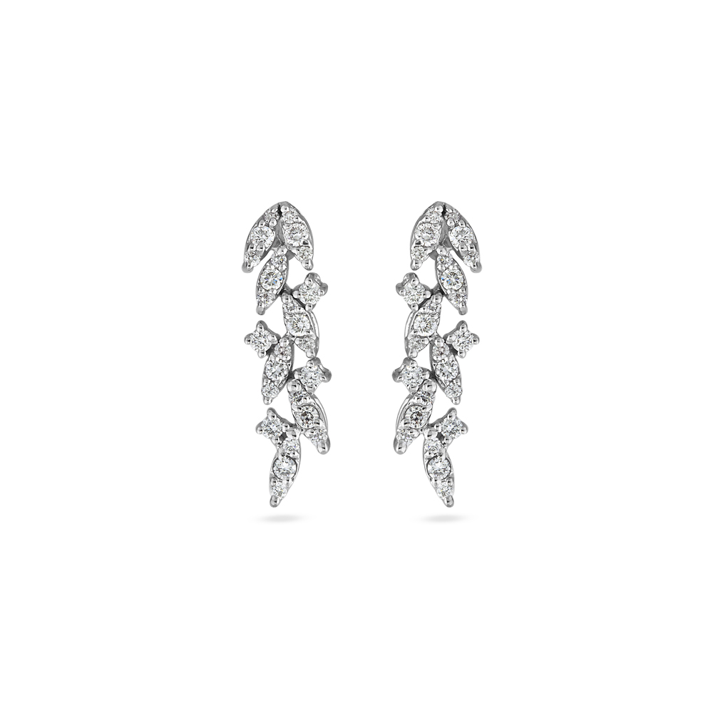 Bu pırlanta küpe, doğadan ilham alan yaprak motifinin en büyüleyici hali. Her küpe floral dal şeklinde tasarlanmış. Markiz ve yuvarlak pırlantalar yaprak formunda cluster oluşturuyor. Aşağı doğru sarkarak devam ediyor. Bu cascade düzen küpeye doğal bir hareket katıyor. Her hareketle yoğun bir parlaklık sunuyor.