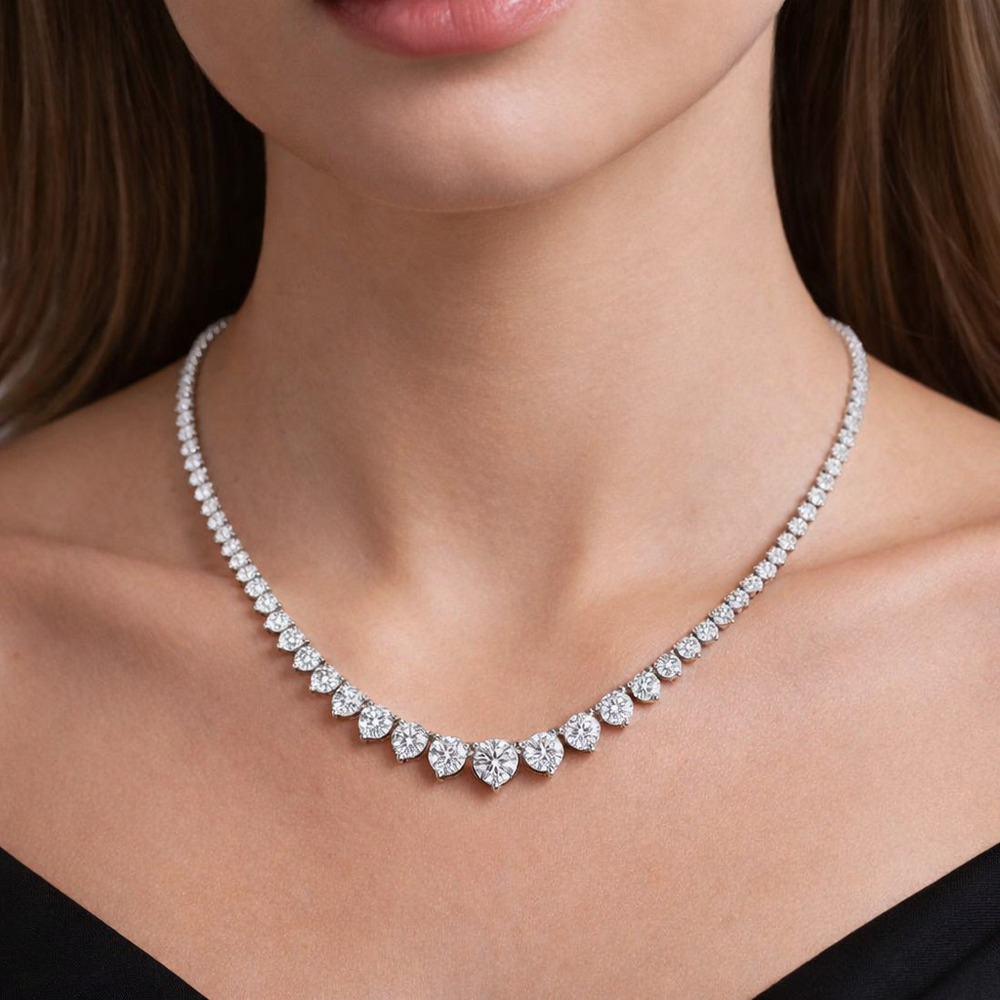 Bu pırlanta kolye, su yolu (riviera) tasarımının en ihtişamlı hali. Yuvarlak brilliant kesim pırlantalar tek sıra halinde sıkıca dizilmiş. Her taş dört tırnakla tutulmuş. Orta kısımda taş boyutları büyüyerek grand bir vurgu yaratıyor. Kesintisiz ve yoğun bir ışıltı akışı sağlıyor. Boyun hattını tamamen saran tam tur modeli.