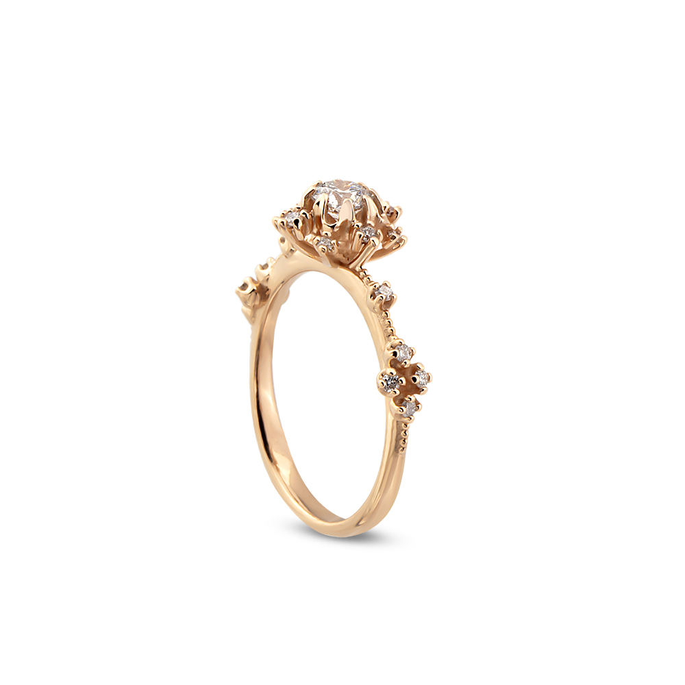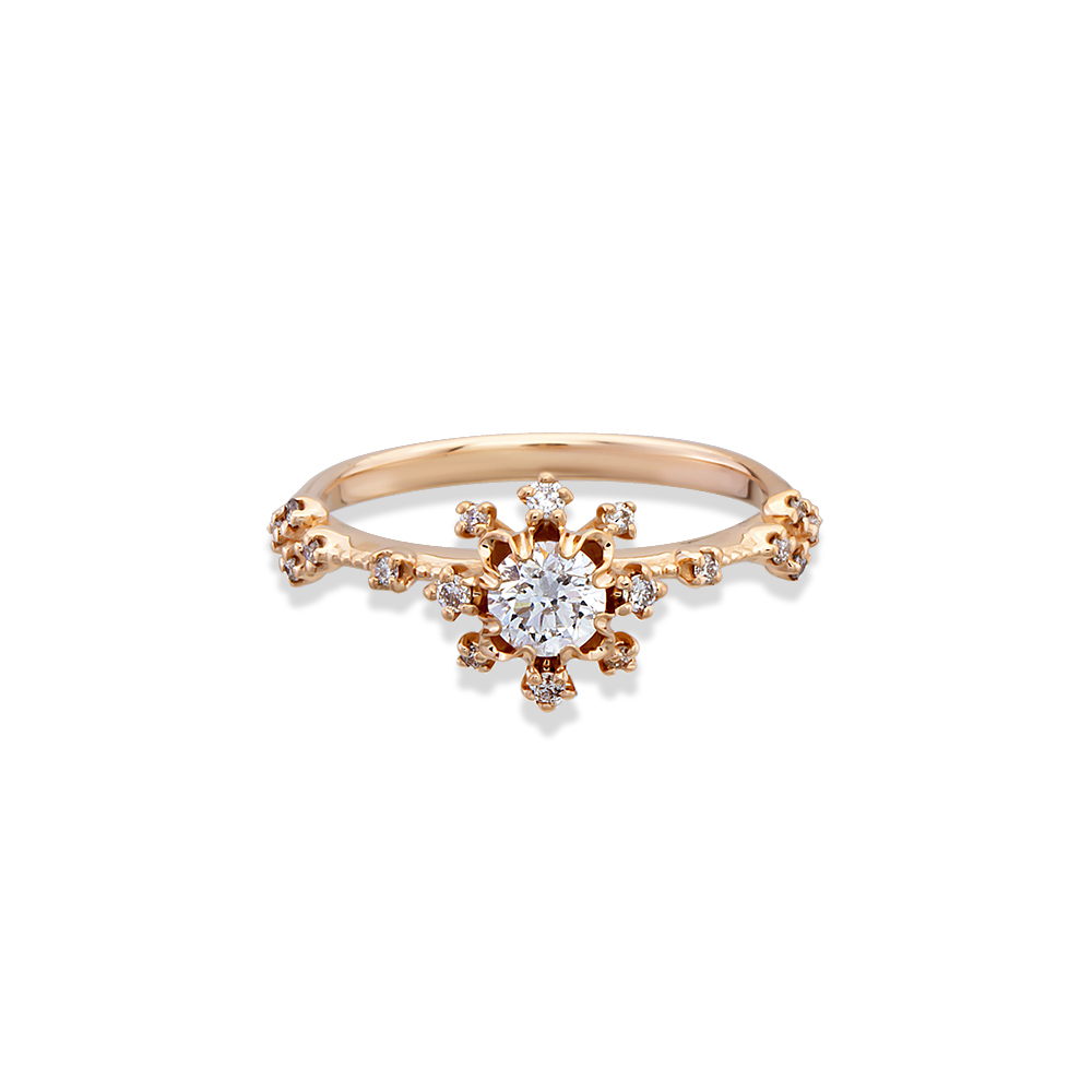 Etrafı yuvarlak minimal pırlantalarla kar tanesi (snowflake) şeklinde çevrili. Bu çiçeksi düzenleme, merkezi taşı adeta bir taç gibi yükseltiyor ve ekstra ışıltı katıyor.
