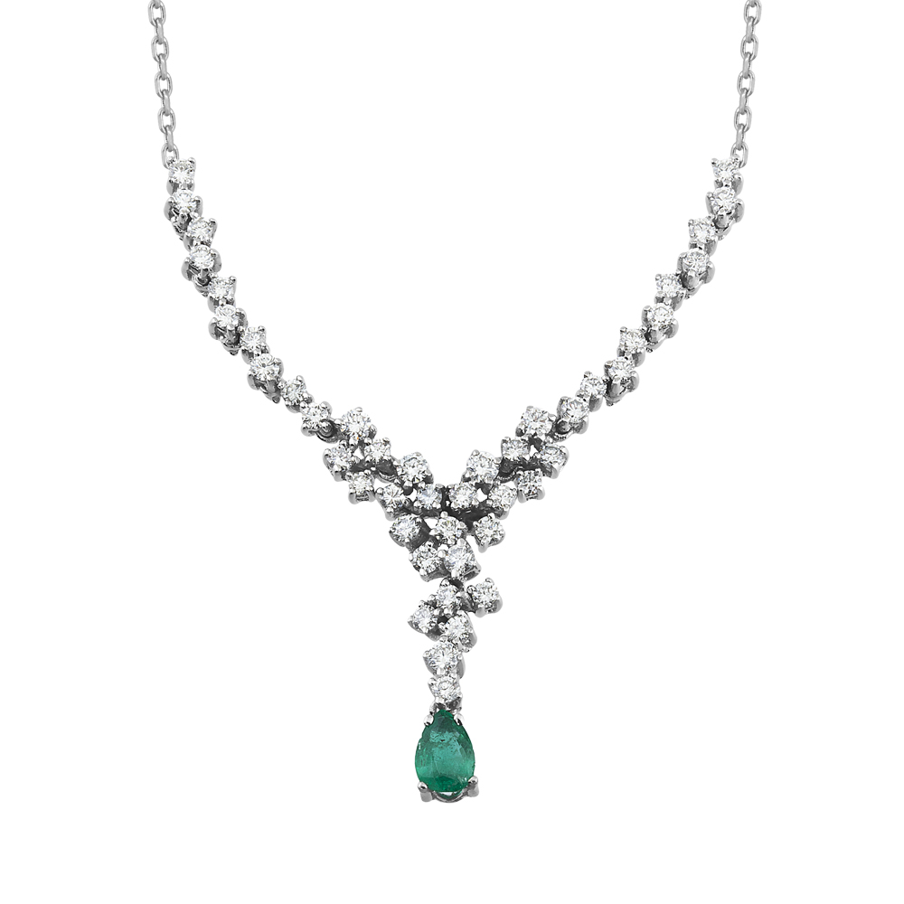 Zümrüt pırlanta kolye – damla cluster V tasarım, modern zarafet ve derin yeşil timeless parlaklık!